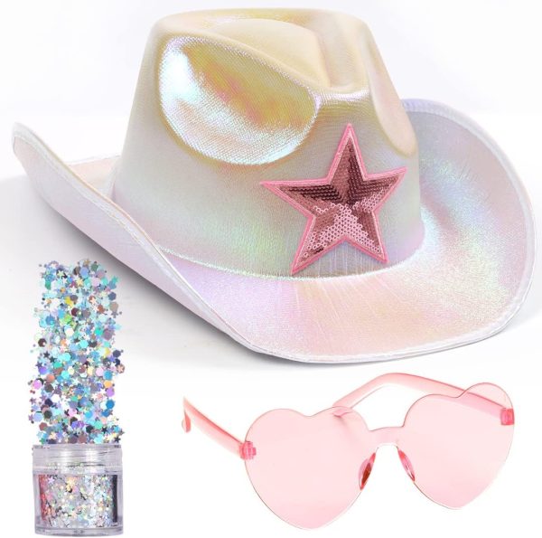 PACKAGE INCLUDES – One set includes 1 pcs white neon space cowboy hat with pink star on it, 1 pcs pink heart shaped transparent sunglasses and 1 pcs silver chunky glitter. Those holographic accessories are a must- have for every cow girl who dreams of becoming a rodeo princess and the heart shaped glasses are a great addition to make it even more fun!